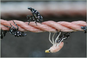 꽃매미는 알, 4령까지의 약충, 그리고 성충 등 각 발육단계마다 뚜렷한 형태적 특징을 가지고 있습니다. 아래 버튼을 눌러 각 단계의 모습을 확인하고 크기를 알아보세요.