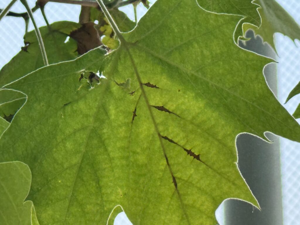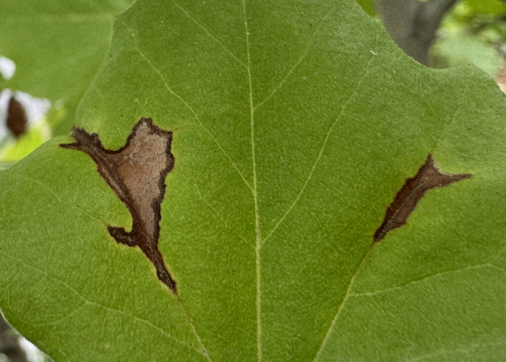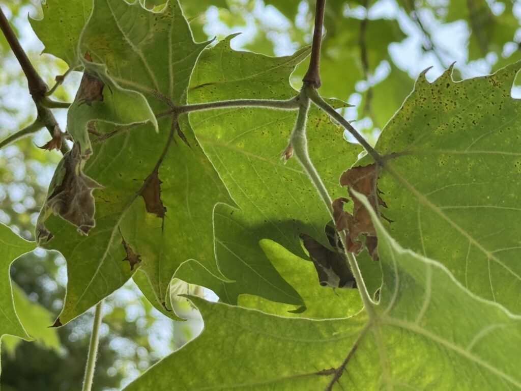 버즘나무탄저병은 잎, 어린가지, 줄기에 다양한 증상을 유발합니다. 특히 잎 뒷면에 검은 배설물과 탈피각이 없어 응애 피해와 구별됩니다.