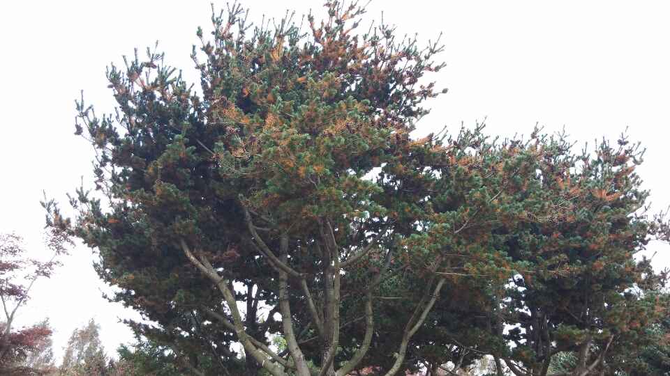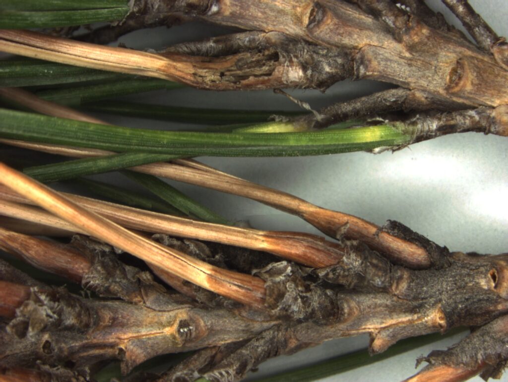 솔잎혹파리 피해는 소나무 신초 및 신엽 생장에 뚜렷한 저해를 미치며, 특히 신엽(새 잎)의 경우 피해를 심하게 받으면 잎의 길이만 짧아지는 것이 아니라 생장 자체가 상대적으로 지연됩니다.