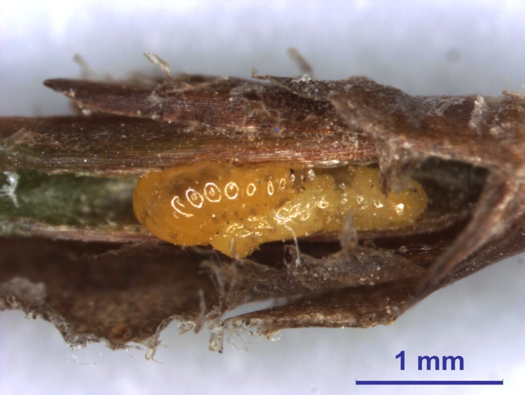 - 월동태: 지피물 밑이나 얕은 흙 속에서 유충 상태로 월동 (일부 벌레혹 안에서 월동하기도 함)