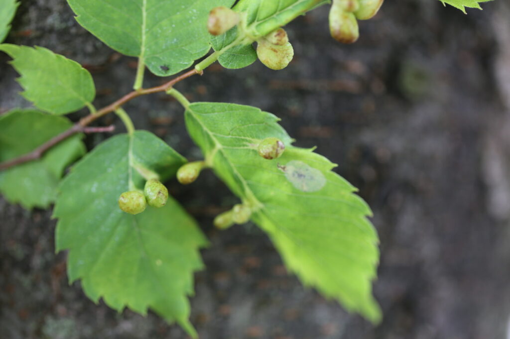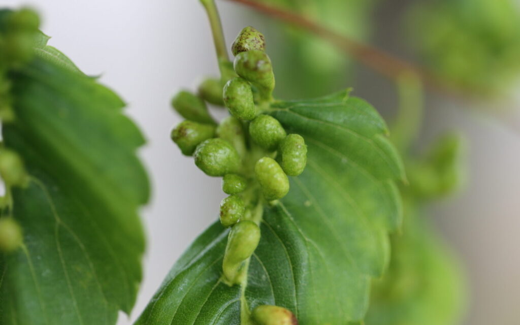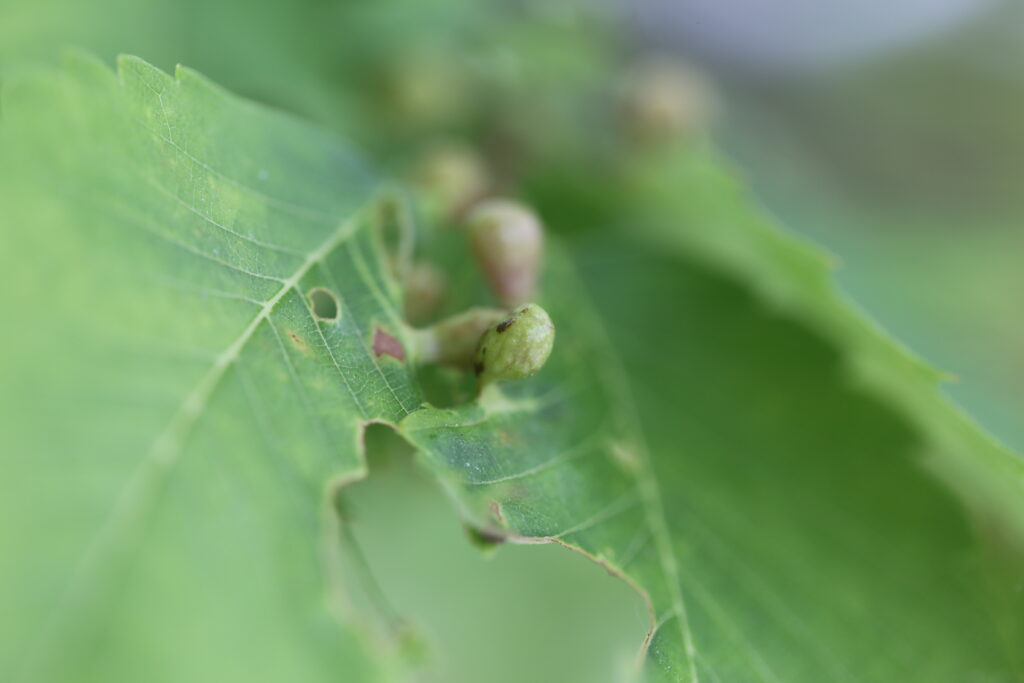 외줄면충은 잎에 표주박 모양의 벌레혹을 형성하고, 이로 인해 잎의 변색 및 미관 손상을 유발합니다.