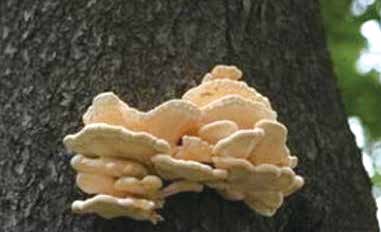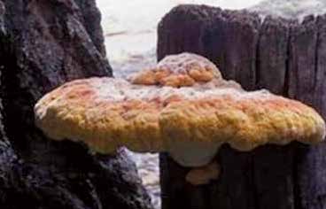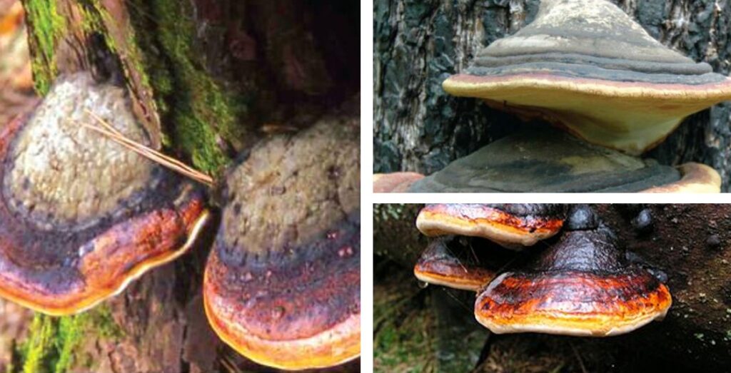 병든 나무의 줄기나 그루터기에 자실체 발생 (덕다리버섯, 붉은덕다리버섯, 소나무잔나비버섯 등)