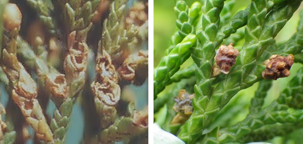 향나무혹파리는 유충이 잎에 벌레혹을 형성하고, 이로 인해 가지 생장이 중지되거나 고사합니다.