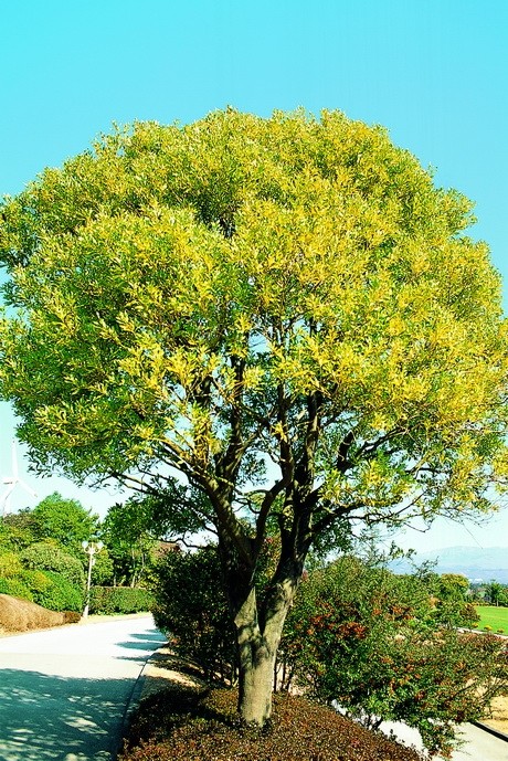 수형: 원추형 또는 둥근형의 늘푸른 넓은잎 큰키나무 (상록 활엽 교목)